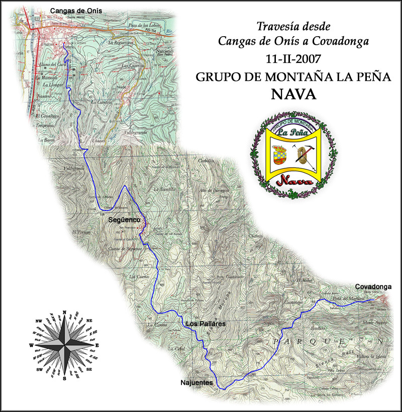 11-II-2007 Se inicia el recorrido de nuestra ruta en la parte alta de Cangas de Onís, junto a la iglesia de Nuestra Señora de la Asunción, la cual se bordea para dirigirse hacia el cementerio, donde se toma una carretera que lo deja a la izquierda y que en prolongado ascenso nos lleva al área recreativa de Llano del Cura, que tiene una buena vista de la ciudad. Al salir de ésta se continúa por el camino de la derecha que, después de ganar altura en un fuerte repecho, se convierte en una buena pista, por la que se sigue subiendo hasta alcanzar una cerrada curva, a los pies de la cual se encuentra la "gran curva del río Sella", lugar donde tomamos el desvío que sale a la derecha y en ascenso se gana la línea de cumbres. Siguiendo por la pista se divisa al frente el Pico Següenco con sus antenas en lo alto, encontrando poco después una encrucijada de caminos, en la que se toma el ramal que sale por el centro dirigiéndose, en subida, al fondo del valle. A media ladera se bordea por la derecha el Porru Uñanes para tomar la dirección del Collado del Becerro (nordeste), tras el cual se gira a la derecha (sudeste), para poco después situarse en el pueblo de Següenco. Atravesando éste con la misma dirección, se encuentra un amplio cruce de caminos con varios indicadores, uno de ellos al Pico Següenco. Una alternativa a la ruta propuesta puede ser la ascensión al mencionado Pico Següenco, fácilmente identificable por las antenas instaladas en su cumbre. Si este es nuestro deseo, volveremos a conectar con la ruta propuesta en la zona de Los Pallares. Los que decidan no subir al pico deben tomar, en el cruce antes citado, el camino de la izquierda, para alcanzar poco después otra encrucijada en la que habrá que tomar el segundo ramal de la derecha, que asciende ligeramente, pasa al lado de una bella cabaña y nos presenta al frente las impresionantes moles del Cornión, para descender después hacia el angosto valle del río Dobra. Más adelante, en una explanada, se gira a la izquierda abandonando la pista para ascender hacia la Majada de Los Pallares, desde donde se continúa por otra recién restaurada que discurre a media ladera, deja a un lado un abrevadero y termina en un llano de donde parten otros dos caminos. Siguiendo por el de la izquierda nos encontramos con una señal indicadora de entrada en el Parque Nacional de Los Picos de Europa e iniciaremos un leve ascenso hacia la Majada de Najuentes. Aquí el camino se vuelve a bifurcar y tendremos que continuar por el de la izquierda (nordeste), que se dirige hacia el fondo del valle, cambia de ladera discurriendo entre monte bajo y se encuentra con un pequeño pico que se bordea por la derecha para dirigirse hacia el Monte Auseba, que aparece detrás de aquél. Al llegar al collado se gira bruscamente a la izquierda abandonando el camino que parece evidente para