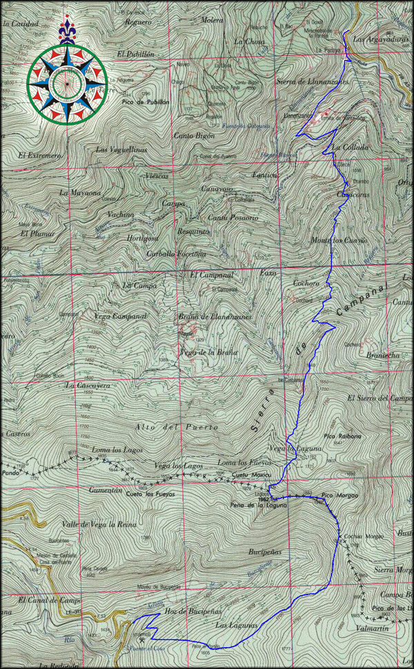 3-VI-2007 El pueblo leonés de Piedrafita (1290 m) y más concretamente la rotonda que hay después de rebasar las casas, tras una marcha por una carretera de buen firme sin asfaltar, es de nuevo punto de partida para la excursión. Comenzamos la travesía siguiendo la inacabada vía de comunicación entre León y Asturias por el puerto de Piedrafita. Una serie de mojones en forma de cilindro alargado jalonan esporádicamente nuestra marcha, en principio al NNE, por la derecha del valle del río Torío. En una curva nos adentramos en el valle de Barcaliente y antes de cruzar el arroyo por un puente (1370 m), nos desviamos a la derecha siguiendo un sendero que nos conduce al Collado Morgao (1775 m). Desde aquí, siguiendo la línea divisoria entre las dos provincias, nos dirigimos hacia la cumbre del Pico Morgao (1947 m). Continuando por la crestera, llegamos a la cumbre del Picu La Laguna (1962 m), altura máxima de nuestra ruta. Lo que pretendemos es conocer la ladera norte del Picu La Laguna y con este rumbo bajamos sorteando las matas de brezo. Dirigiéndonos a la derecha desembocamos en el rellano del pequeño anfiteatro que atesora la circunstancial laguna (1775 m). La rodeamos con intención de alcanzar el montículo situado al NE, denominado Llomba Los Corredores (1847 m), desde el cual obtenemos una magnífica vista de pájaro sobre el pueblo de Ríu Aller. Esta elevación de modesta altura forma el vértice superior de la xerra Campanal. De vuelta a la cubeta recuperamos la dirección N siguiendo un sendero del ganado que baja por la derecha del valle conduciéndonos al mayáu La Carbazosa, con varias cabañas, una de ellas bien conservada ya que es habitada en la temporada (1600 m). A nuestra izquierda se alza la estilizada figura del cuetu Muxicu. Otra vez en el camino al N por la ladera occidental de la xerra Campanal, penetramos en el bosque de hayas atravesando un paraje que encierra una singular belleza; con niebla o sol, también bajo la lluvia, siempre nos ha llamado la atención visitar esta zona. En el descenso dejamos a la derecha un sendero llano (1500 m). Tras una serie de vueltas salimos a los espacios abiertos del mayáu Cochero (1380 m), con tres cabañas buenas, una fuente y las fincas cercadas por grandes llábanas de piedra entretejidas por ramas. En este lugar enlazamos con un camino procedente del colláu Rocín, en las cercanías del Puertu Piedrafita. Éste viene bordeando prácticamente en llano la ladera norte de La Laguna a través del idílico rincón de la braña Yananzanes. Continuamos sobre los cierres hasta el final, donde hay una bifurcación. Dejamos a la derecha el comino llano que rodea la sierra para llegar al mayáu La Braniella y bajamos de frente al N, de nuevo a la sombra del bosque, del que salimos un momento al situarnos sobre el contrafuerte. (1260 m). Desde este lugar damos vista a algunas casas del pueblo de Ríu Aller. Más abajo caminamos por un entalle rocoso a la izquierda de un peñón y volvemos sobre la sierra por el colláu Les Calzaures (1135 m). A partir de aquí nos despegamos de la línea del contrafuerte y bajamos encajonados por el terreno pasando junto a una fuente bañera y una cabaña del mayáu Les Calzaures o El Cuncu (1075 m). Tras recibir un camino por la izquierda que viene de las cabañas de El Cuncu, llegamos a una encrucijada (885 m). Vamos a dejar un desvío a cada lado para coger el menos importante, aunque el de la izquierda también conduce a Yananzanes. Enseguida sobrepasamos el canal que lleva agua para la central eléctrica de La Paraya y luego entramos en el pueblo a la vera de la casa número 11. Calle abajo nos desviamos a la izquierda pasando junto al cobertizo del lavadero. Al rebasar la iglesia salimos a la carreterita asfaltada en mitad de Yananzanes, donde se encuentra la antigua escuela (765 m), enlazando con el camino que baja del Puertu Piedrafita. Reanudamos la travesía por este ramal que desciende decididamente al NE. En la segunda curva que damos con giro a la izquierda, muy cerrada, recibimos el viejo camino del Puerto Vegará por el lado contrario. Inmediatamente cruzamos el ríu Aller por el puente del caserío La Paraya (650 m), confluyendo, a la par que los ríos, con la carretera del valle. Sólo resta caminar por ella al N para concluir la ruta en la localidad de Casomera (640 m).